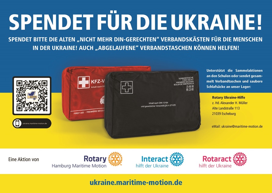 Im Rahmen der Hilfsaktion für die Ukraine suchen wir dringend (auch nicht mehr DIN-gerechte / abgelaufene) VERBANDKÄSTEN bzw. -TASCHEN. Abgegeben werden können diese bei den Sammelaktionen an Schulen oder direkt an unserem Lagern. Gerne nehmen wir auch SAUBERE SCHLAFSÄCKE entgegen.